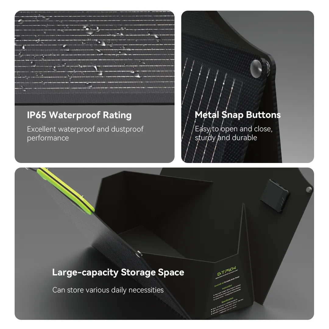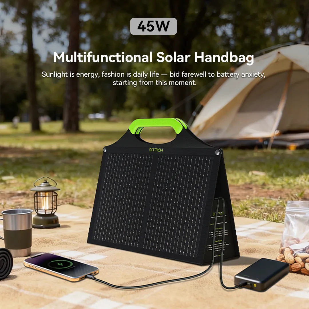 GTPOW 45W Portable Solar Charger Tote integrates a 45W high-efficiency solar panel and multi-port fast charging in a foldable, IP65 water/dust-resistant design—ideal for outdoor adventures, on-the-go power needs, and off-grid use.