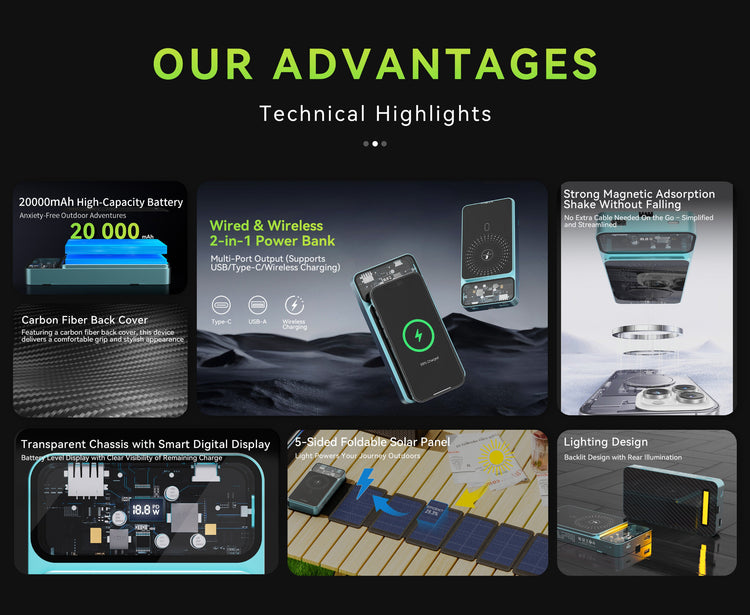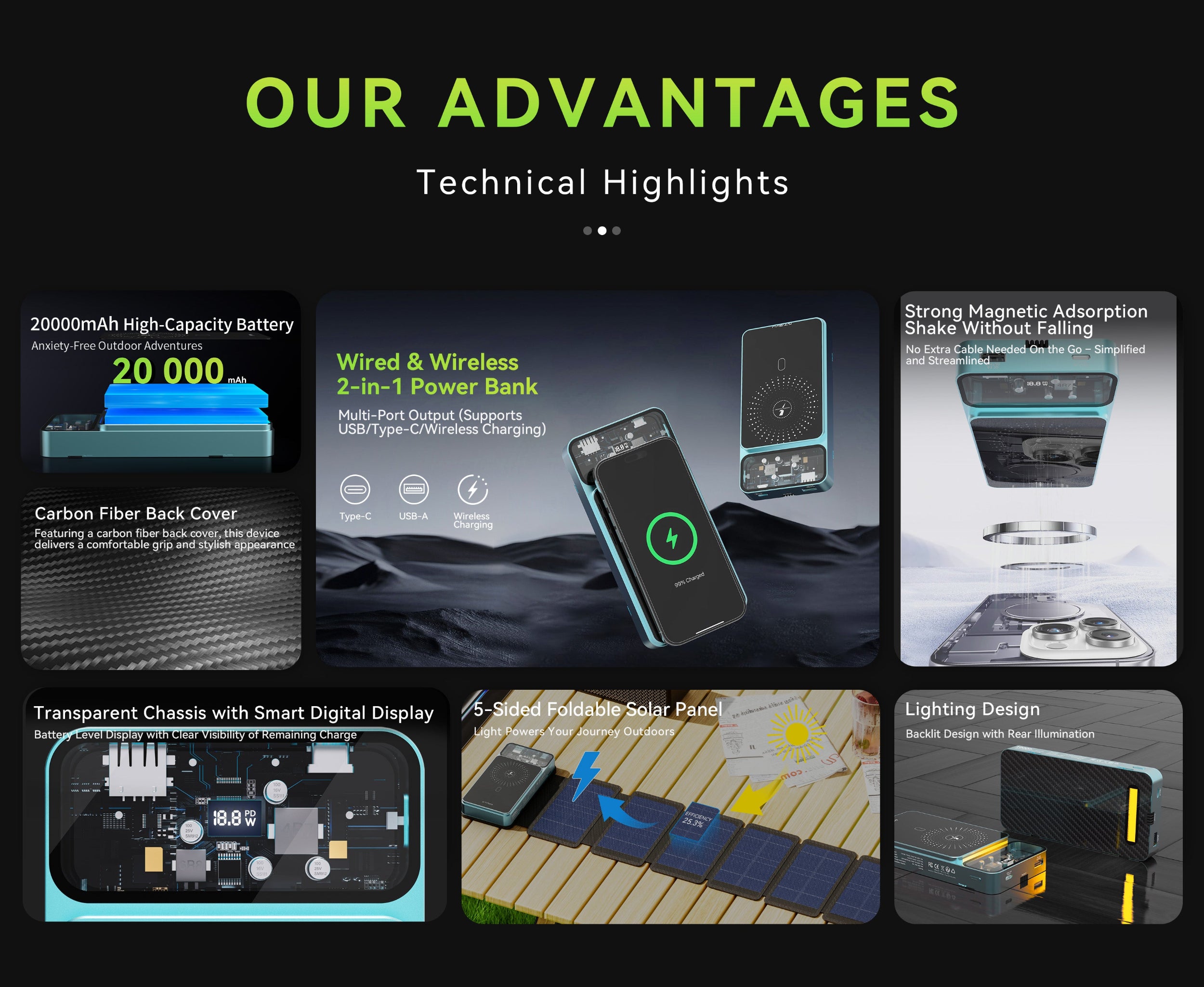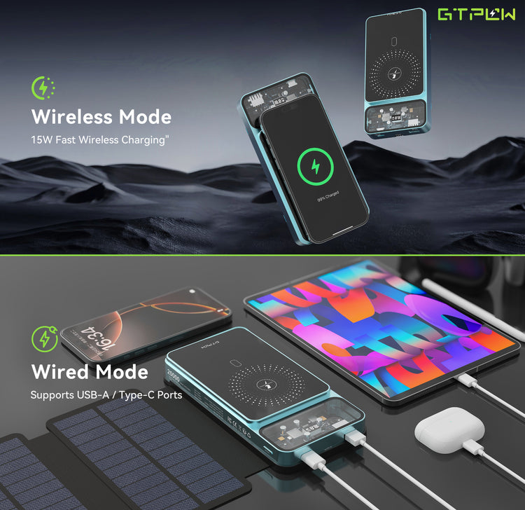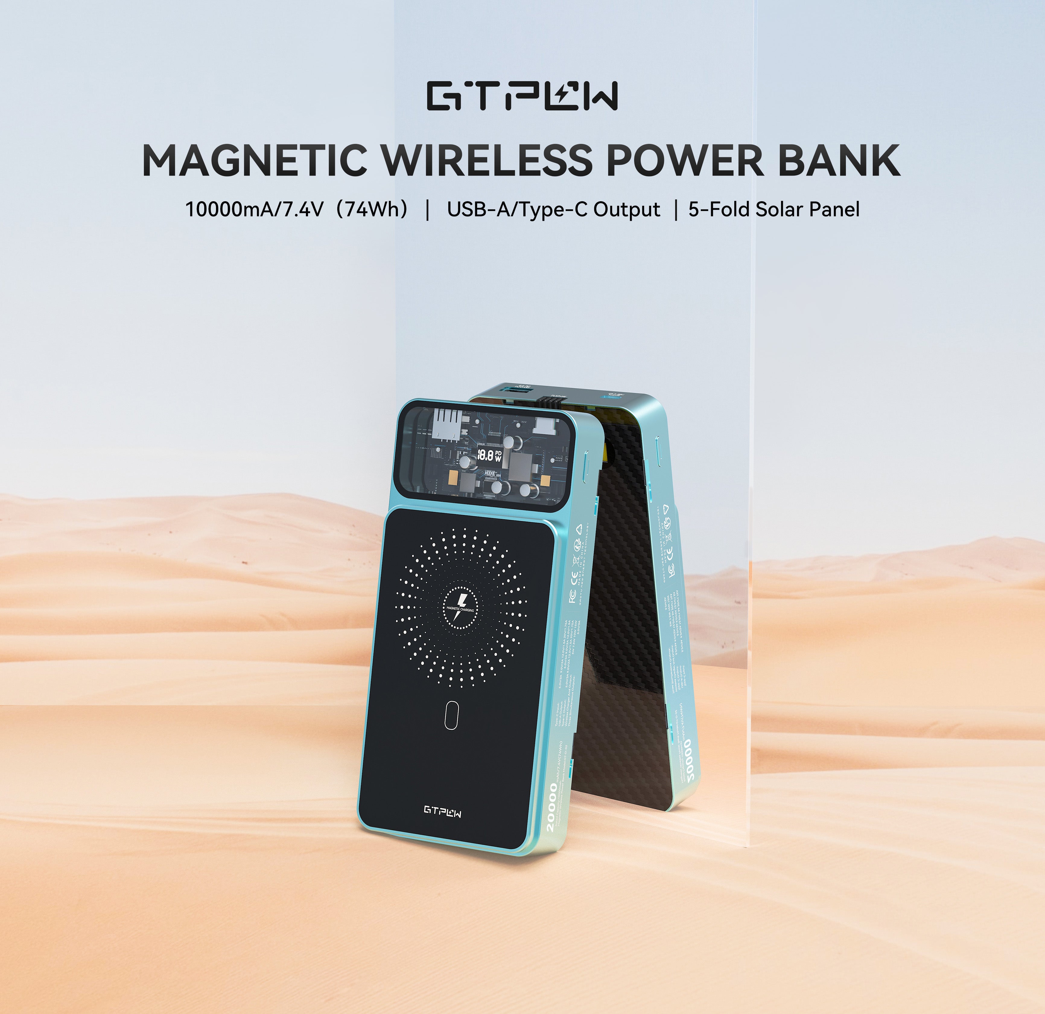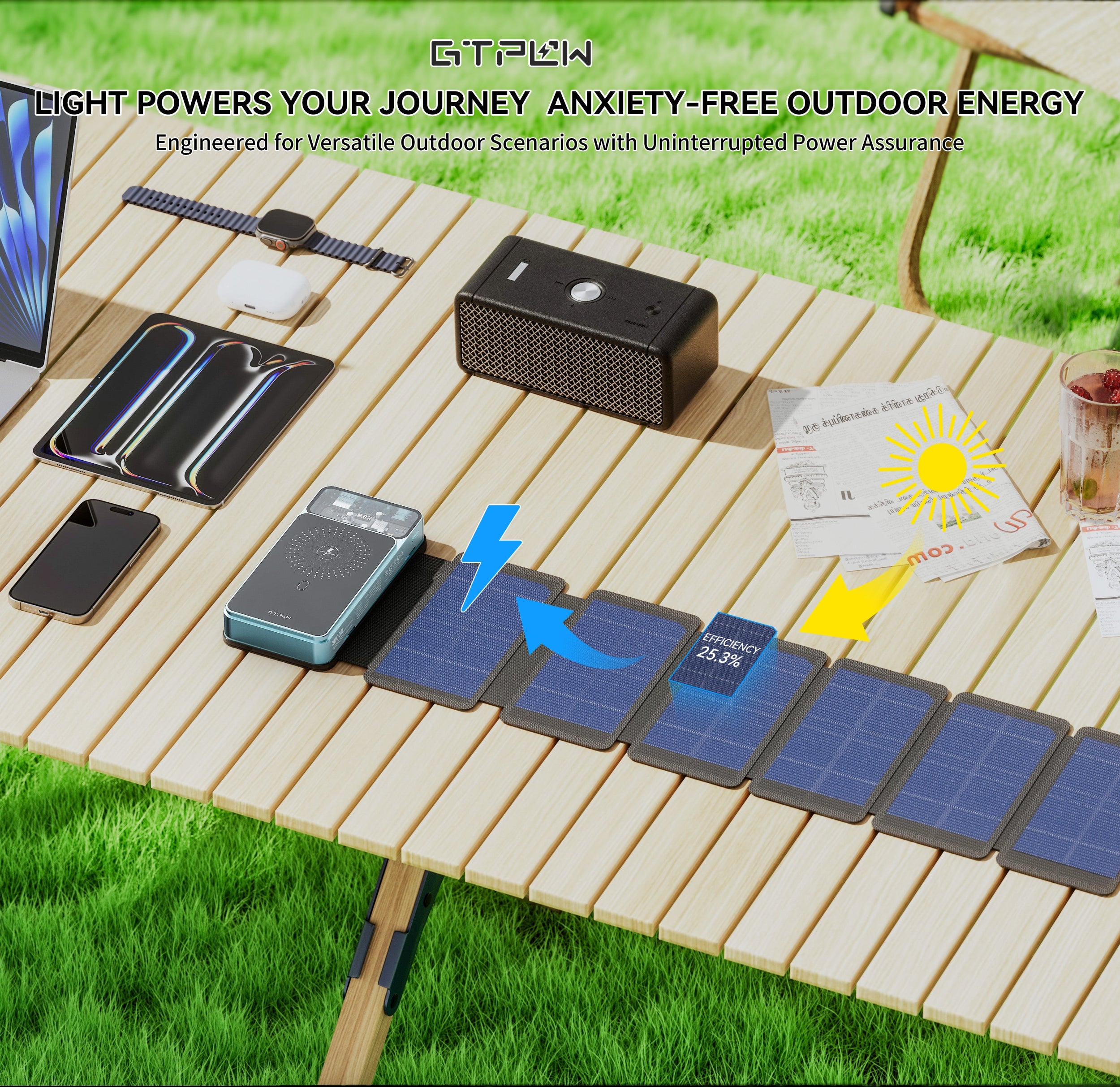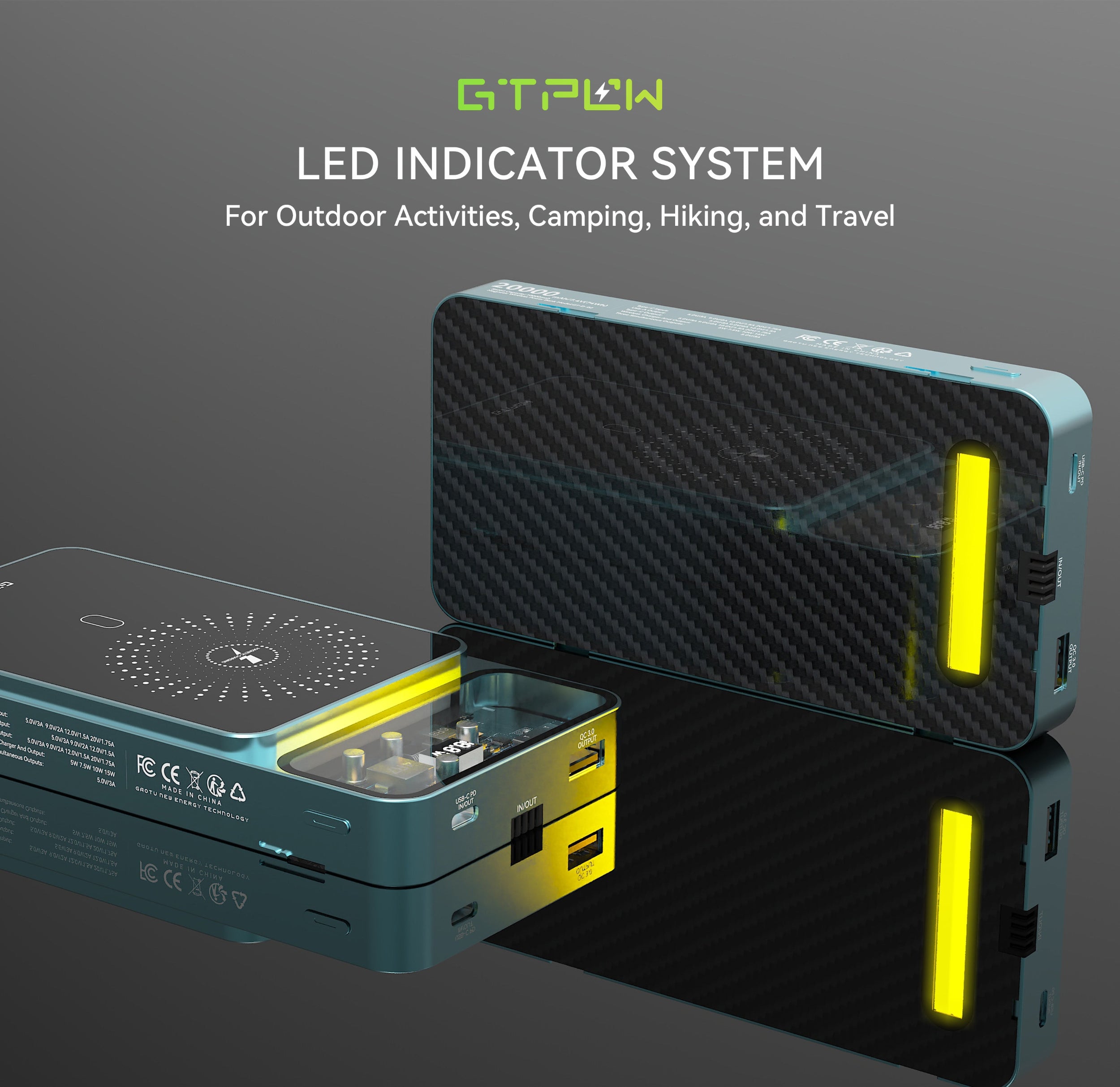 Stay powered anywhere with a compact 20000mAh power bank that supports 35W fast charging, wireless output, LED lighting, and solar panel compatibility for reliable off-grid energy.