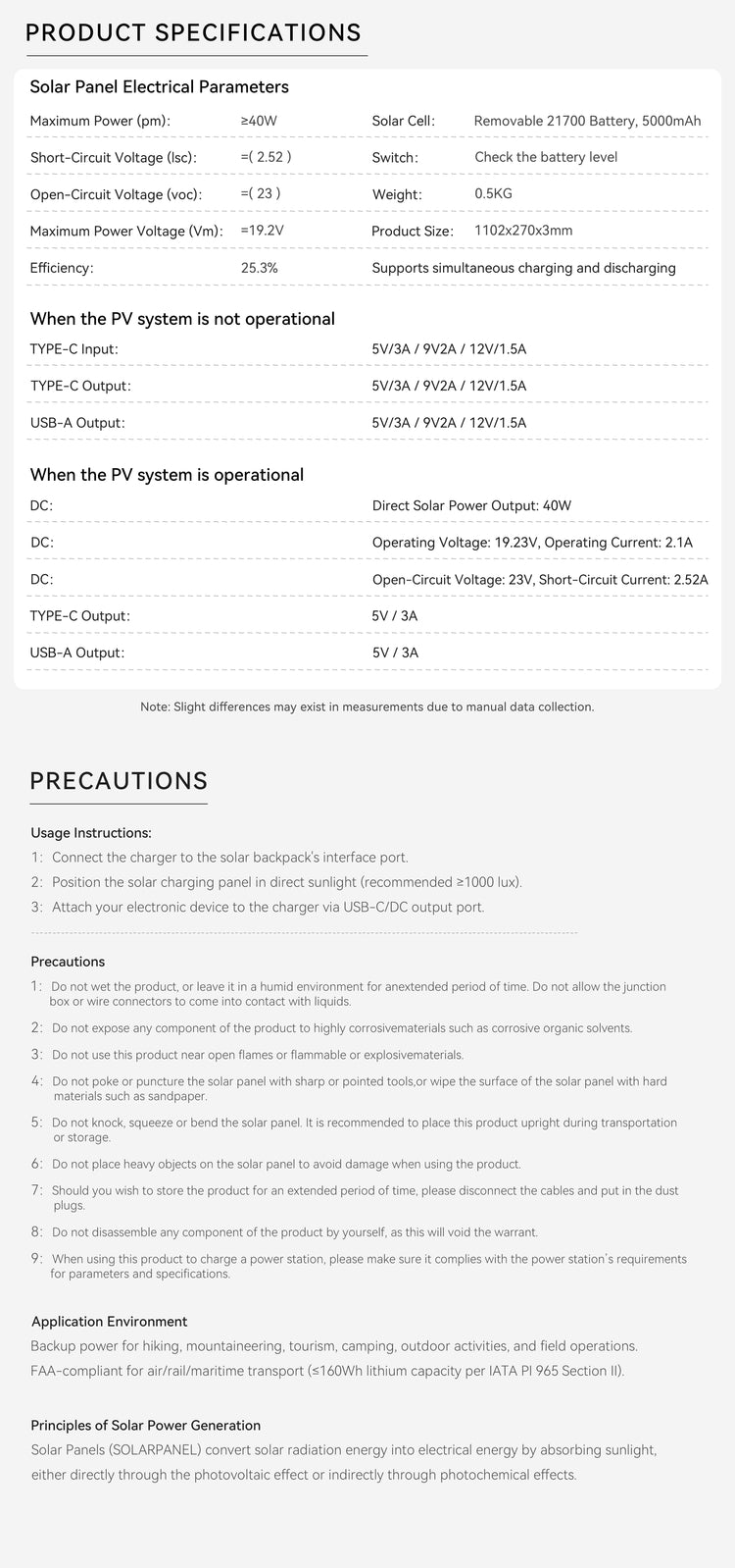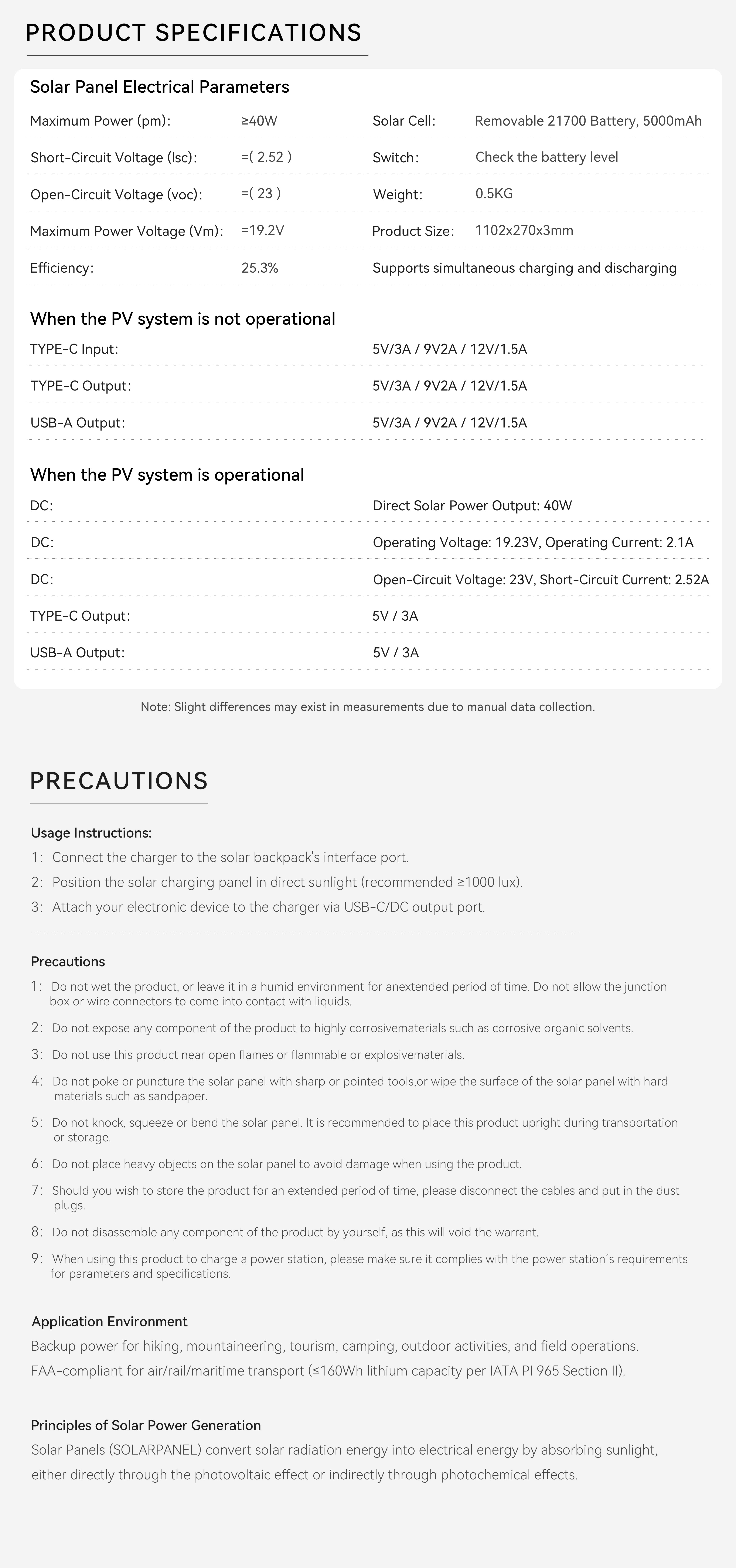 Under optimal sunlight, the panel can deliver up to 40W of power, with a total output current of up to 10A. Actual performance depends on sunlight conditions.