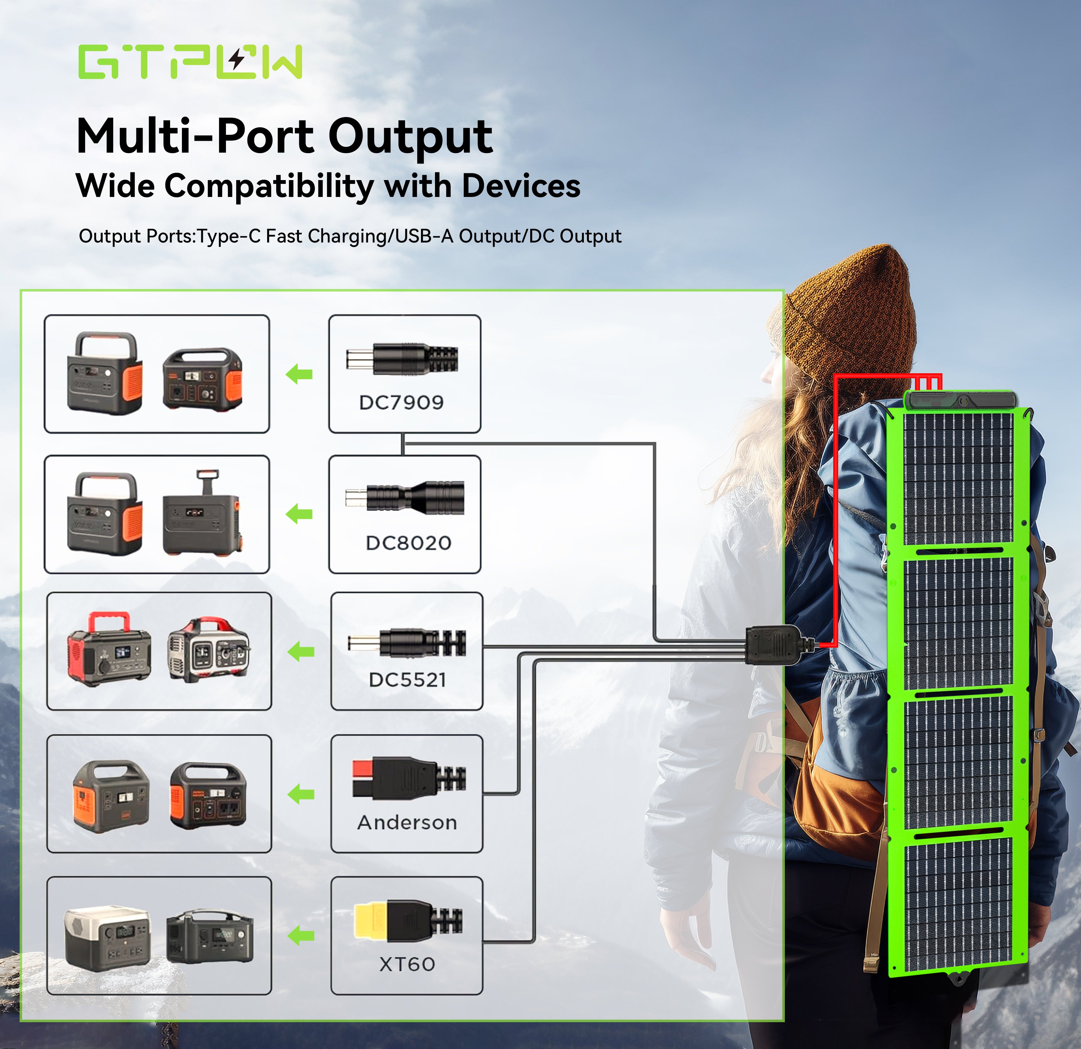 This panel supports USB-A, Type-C, and DC output. It can charge smartphones, tablets, power banks, flashlights, action cameras, and other small USB-compatible devices.