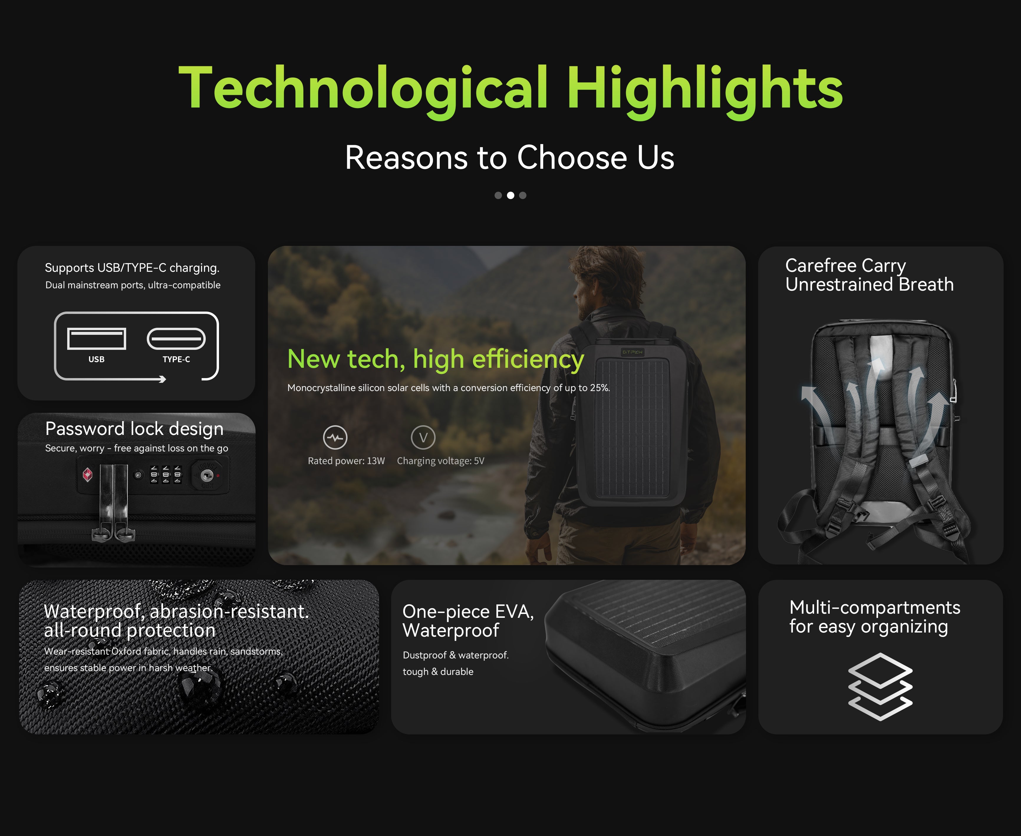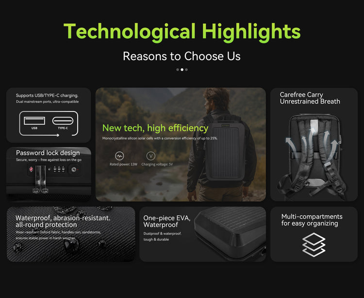 The backpack features a 13W high-efficiency monocrystalline solar panel with up to 25% energy conversion. This allows you to charge your devices directly from sunlight, even while on the go.