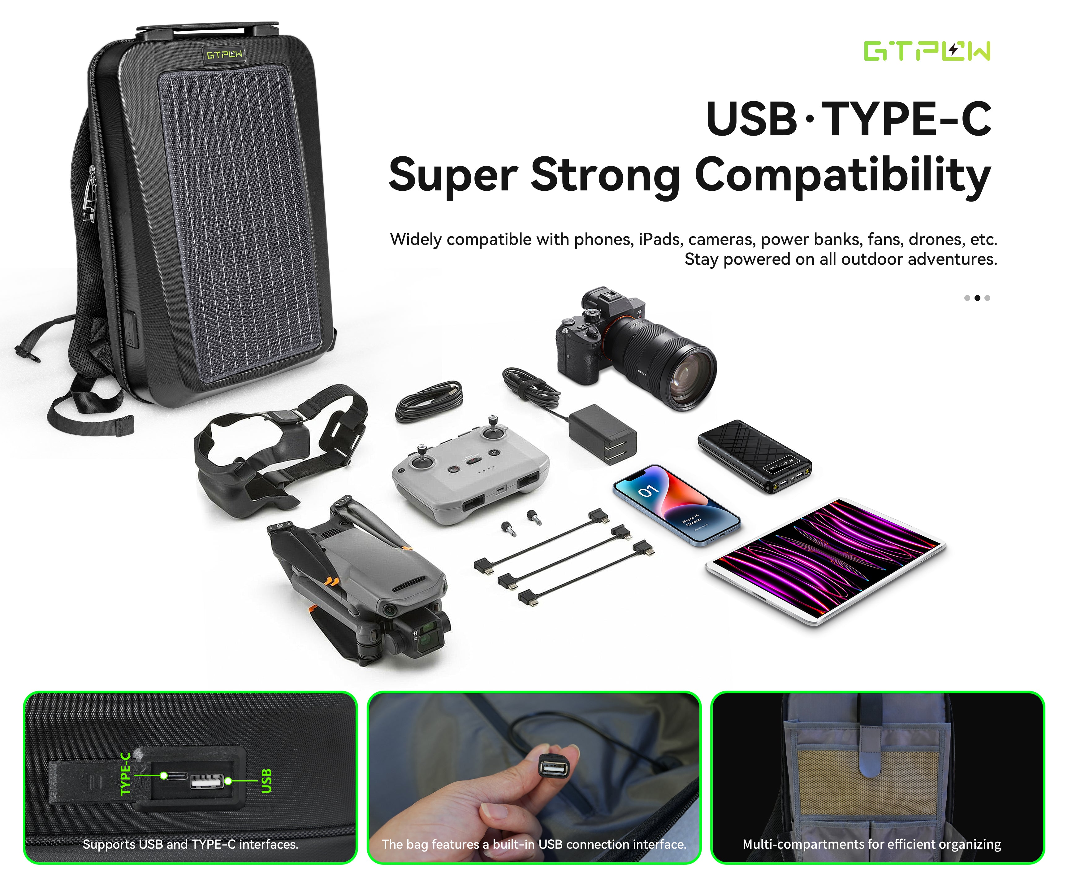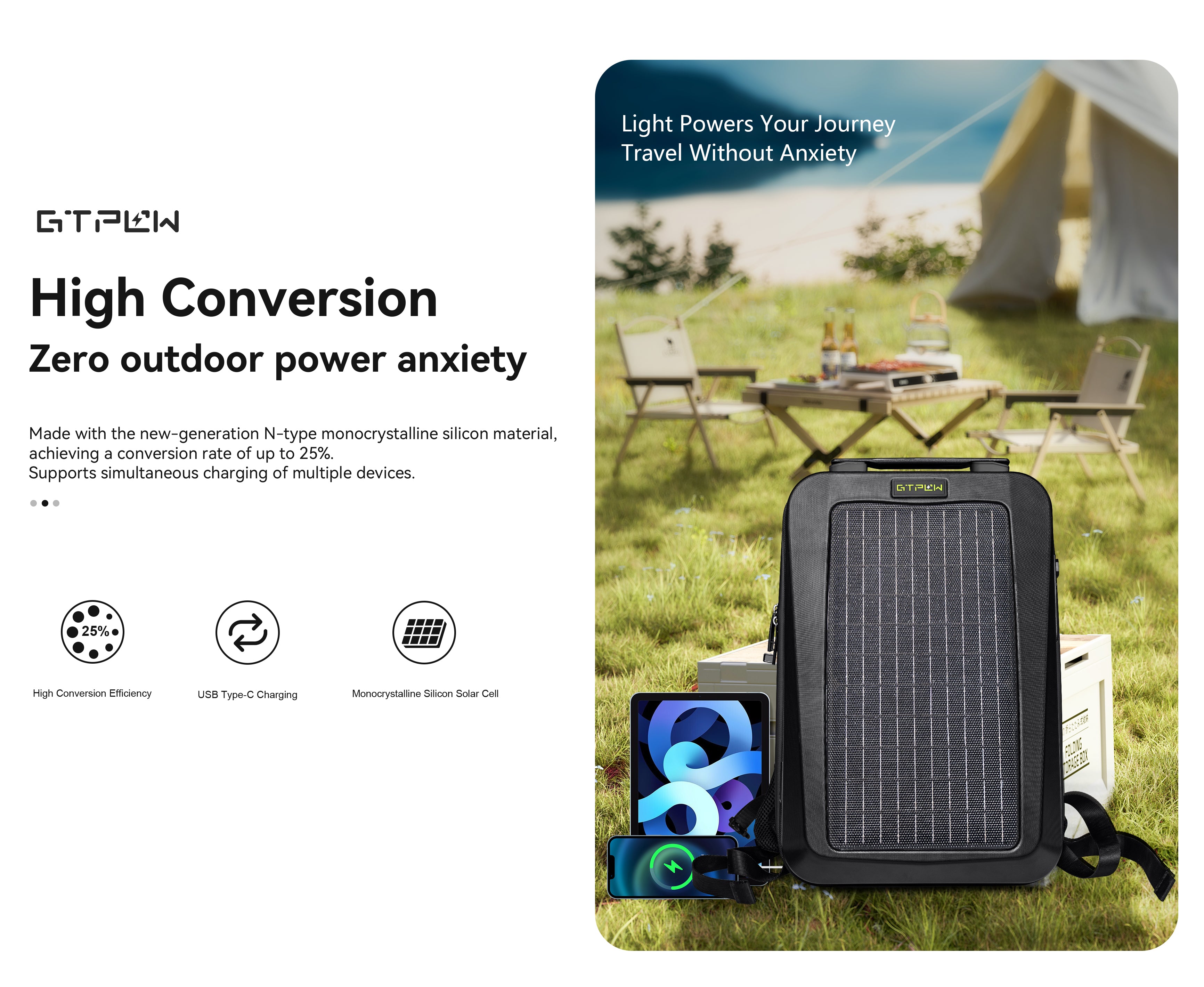 Equipped with high-performance monocrystalline solar panels with up to 25% conversion efficiency, this backpack provides reliable on-the-go power for smartphones, tablets, cameras, and other USB/Type-C devices — no outlet needed.